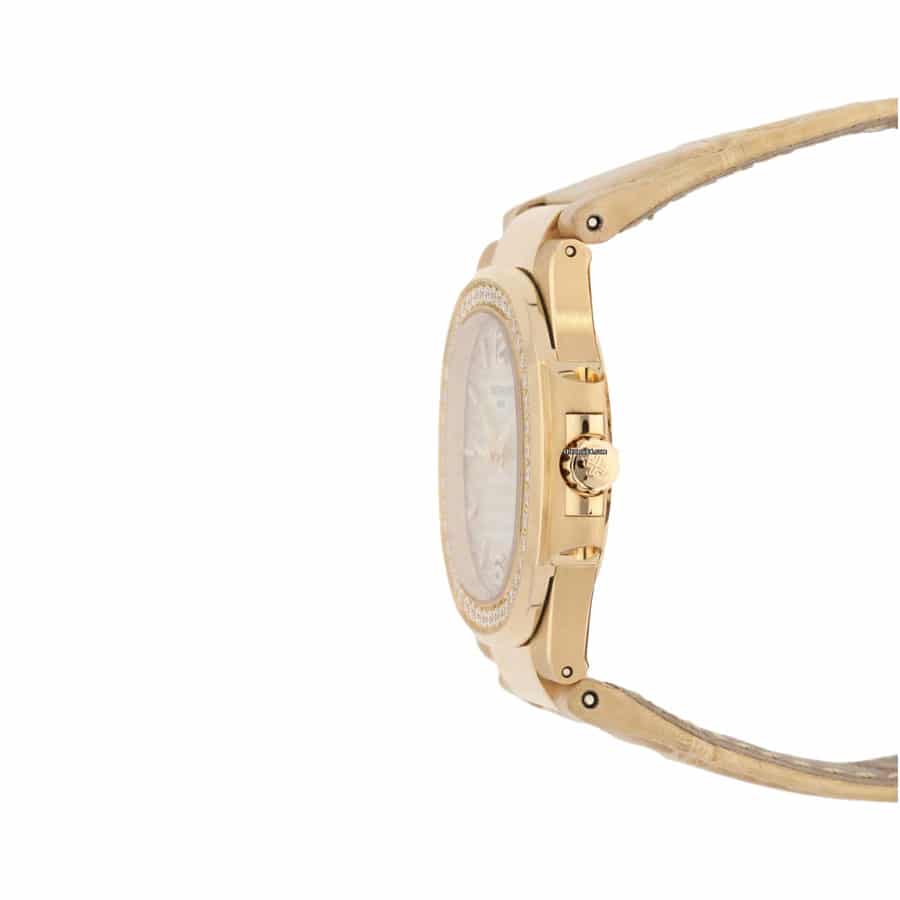 The Patek Philippe Nautilus 7010R-011 Replica is a high quality watch. It features a stainless steel case with a rose gold color and a gem set bezel. The movement is an automatic caliber E23-250 S C with a power reserve of 60 hours and a precision of (-3/+3 sec/day) within COSC certification limits. The second hand has a sweep motion. The bracelet is made of crocodile skin with adjustable links and a stainless steel fold-over clasp in rose gold.