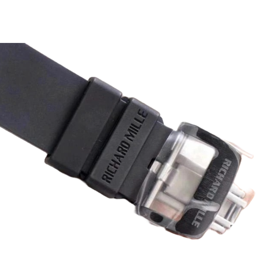 The black rubber strap offers sporty elegance and is tailored for comfort, durability, and secure daily wear. It features adjustable links that mirror the fit of the original RM52-01 and is secured with a black fold clasp made from 316L stainless steel. This ensures both functionality and a seamless aesthetic from case to clasp.