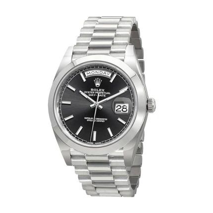 The Rolex Day-Date 228239 Silver Black Dial Replica is a luxurious watch that is sure to impress. It features a 904L stainless steel case and bezel, with a white gold color. The sapphire crystal is 40.00 mm in size and 12.00 mm in thickness. The bracelet is also made of 904L stainless steel, with an adjustable link and a double-fold clasp. The black dial features stick and dot indices, with 904L stainless steel hour markers and hands.
